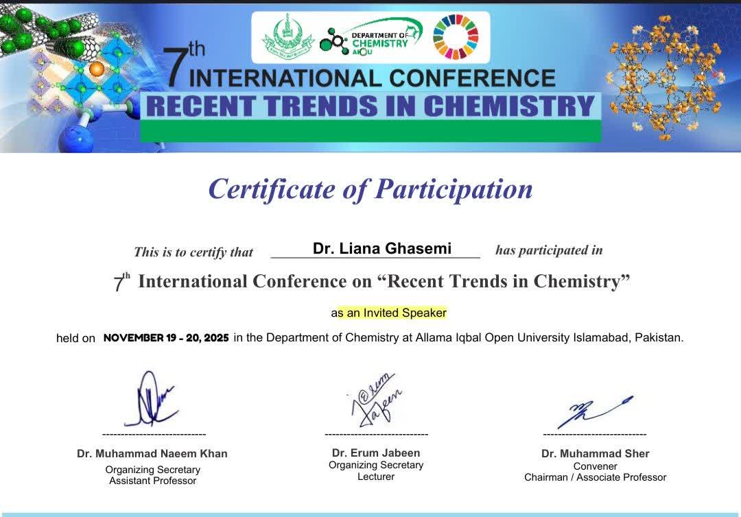 سرکار خانم دکتر لیانا قاسمی، محقق پسا‌دکتری جناب آقای دکتر مهدی بهزاد، به‌عنوان سخنران مدعو در هفتمین کنفرانس بین‌المللی «Recent Trends in Chemistry» حضور یافتند.