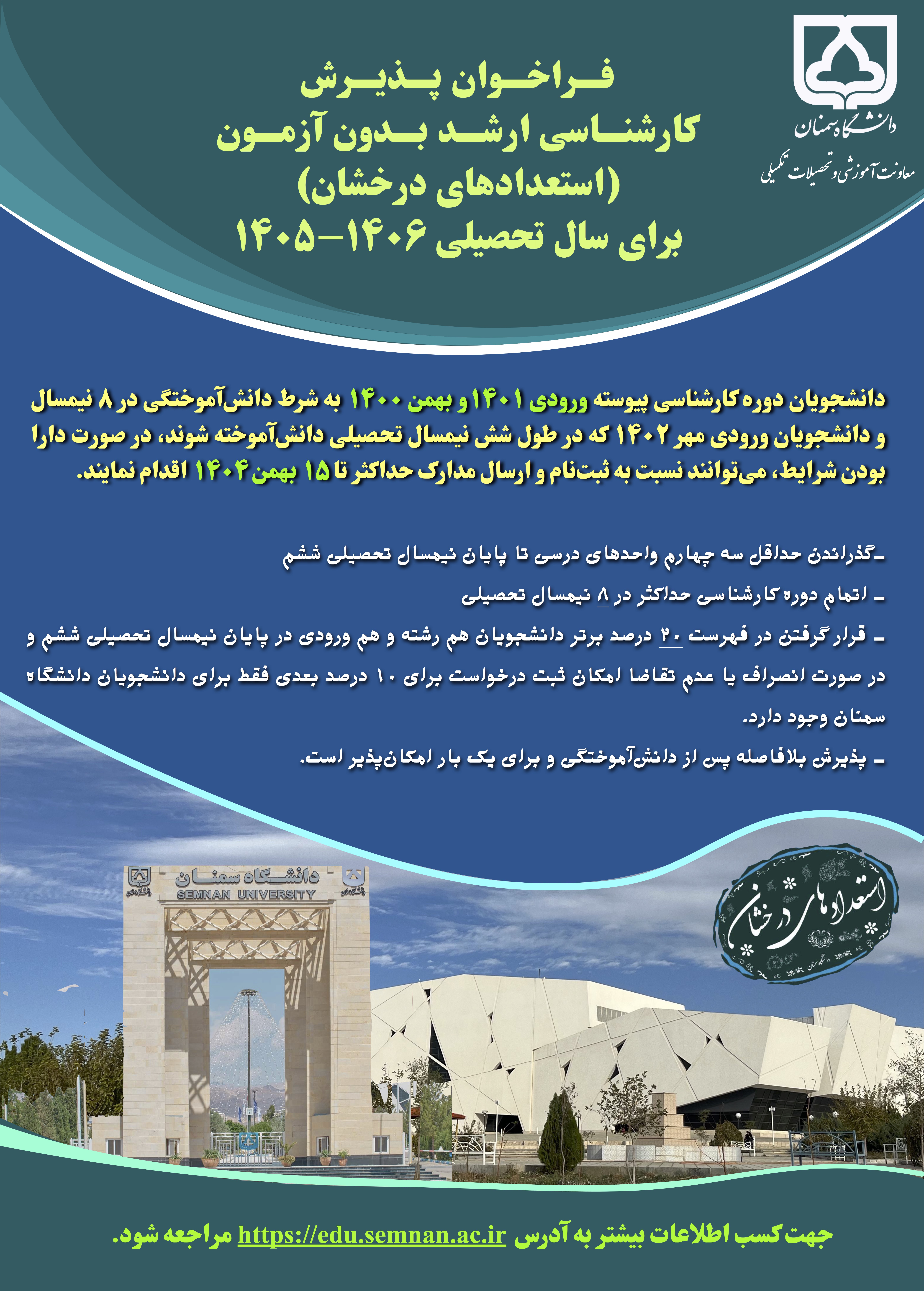 لینک فراخوان در وبگاه دانشگاه : https://edu.semnan.ac.ir/ZwFa